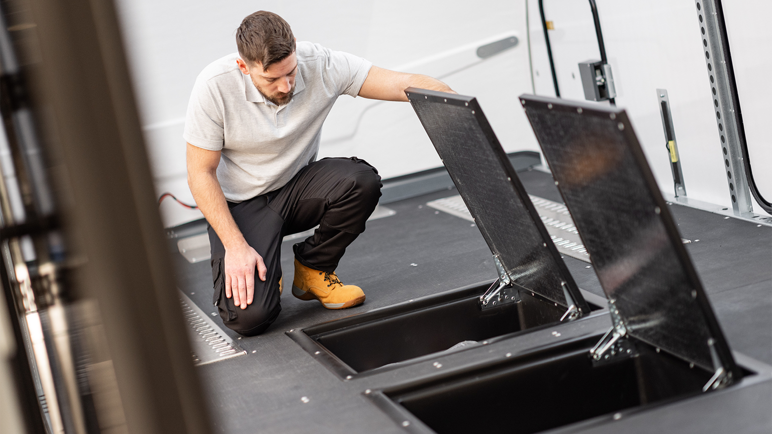 - 2 coffres de rangement centraux longitudinaux encastrés sous le plancher avec couvercles à ouverture assistée