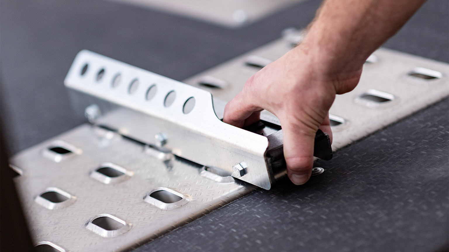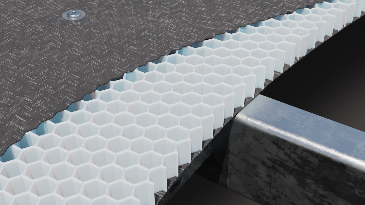 - Plancher en matériau composite à structure ‘nid d’abeille’ ultra-léger, intégrant des bandes de roulement matricées avec perforations oblongues pour arrimage des sangles de roues et ancrage des cales de roues