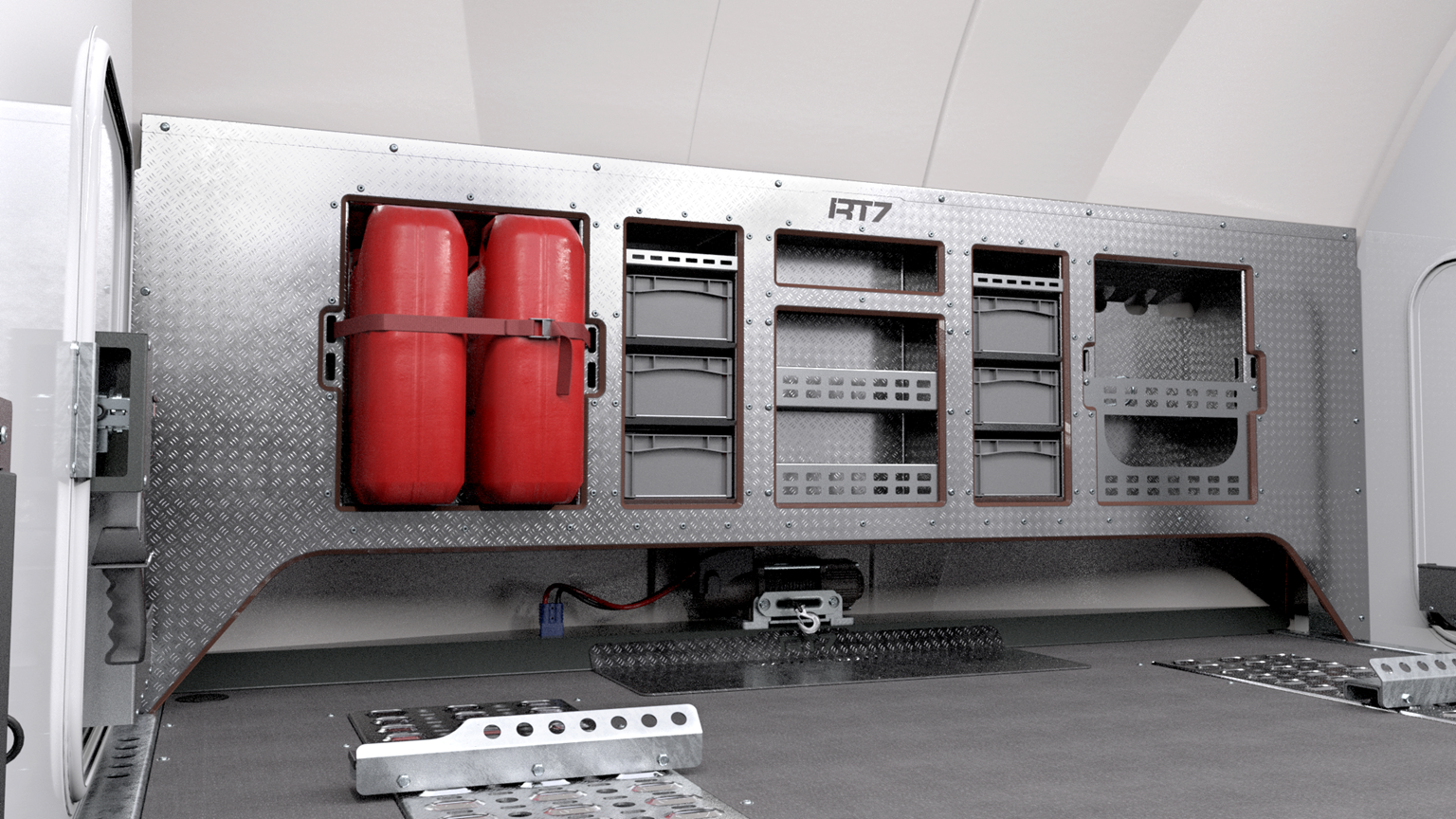 - Compartiment de rangement PREMIUM en aluminium intégré dans le profil avant aérodynamique pour 4 jerrycans avec 2 étagères et 6 bacs de rangement coulissants pour petit outillage